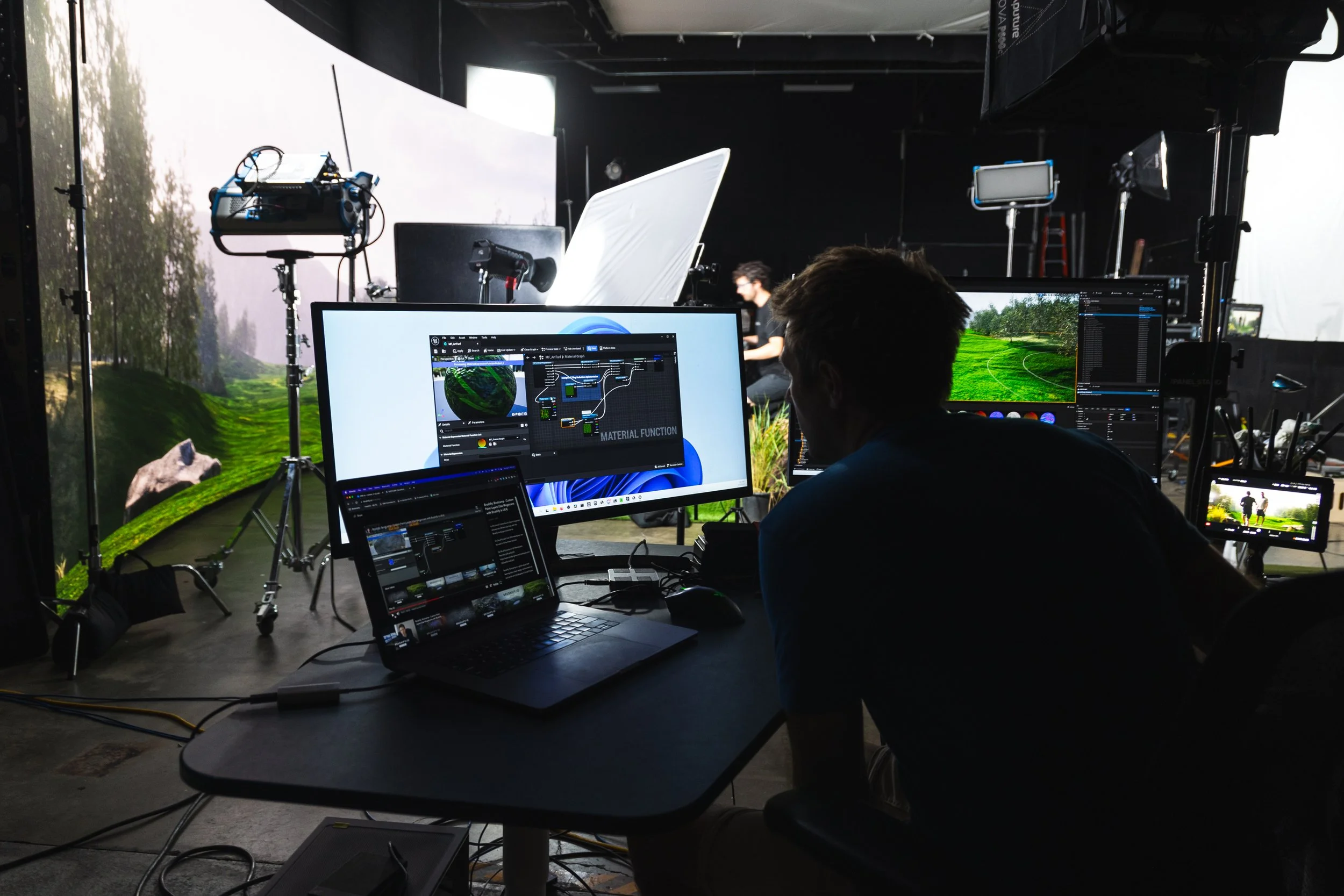 As we started production, the benefits of using Unreal Engine quickly became apparent. We were able to design a golf course with towering mountains - something you certainly wouldn’t find in Minnesota. Most importantly, we had a sun and climate that were fully adjustable to help us lock in what time and what conditions we wanted to shoot in. Not having to the chase the sun allowed us to work at a fast and comfortable pace, giving us the flexibility to do multiple takes under the same lighting conditions. As our virtual world was coming together, our production team crafted a physical tee box for our actor to stand on to help sell the virtual background. We brought in turf, rock, sand, and plants to fully create this immersive environment.